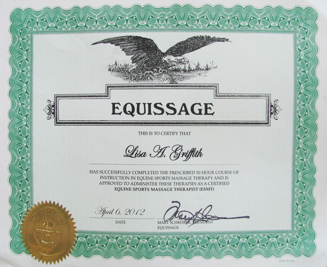 I was trained in Virginia at the home of Equissage and the program included a one week "hands on"  intensive course coupled with audio teaching, lots of ongoing reading material, and culminated in a  written as well as a hands on exam.   In order to be an effective therapist, I feel that it is imperative to get trained through a hands on program with a skilled professional who offers extensive knowledge and experience. The founder of Equissage, Mary Schreiber, fills that bill! She has also become a dear friend and she is available to me and all her trainees for consultation