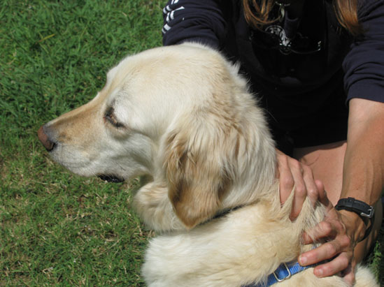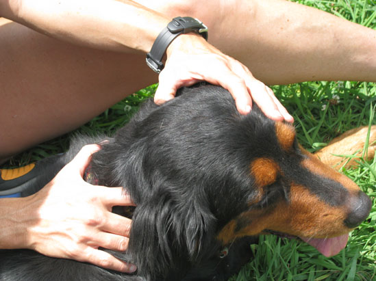 Within hours after the massage Marley began to be able to stand again and in just a few days was back to his old self; chasing after sticks I threw for him as we played in the yard at home.